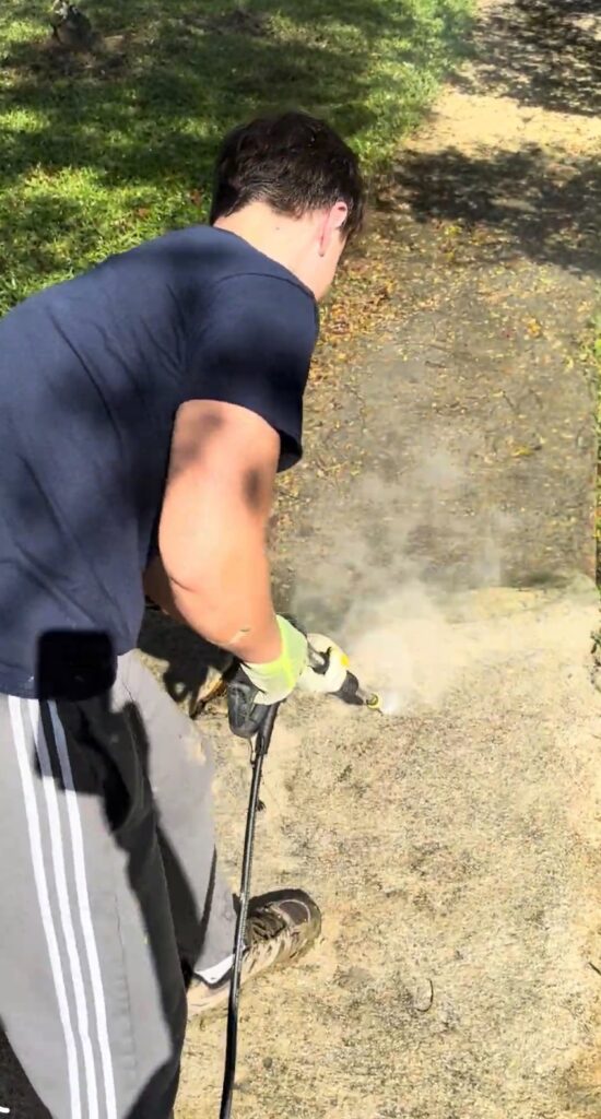 Marco Belluzi ‘26 power washes a pathway at the retreat center.
