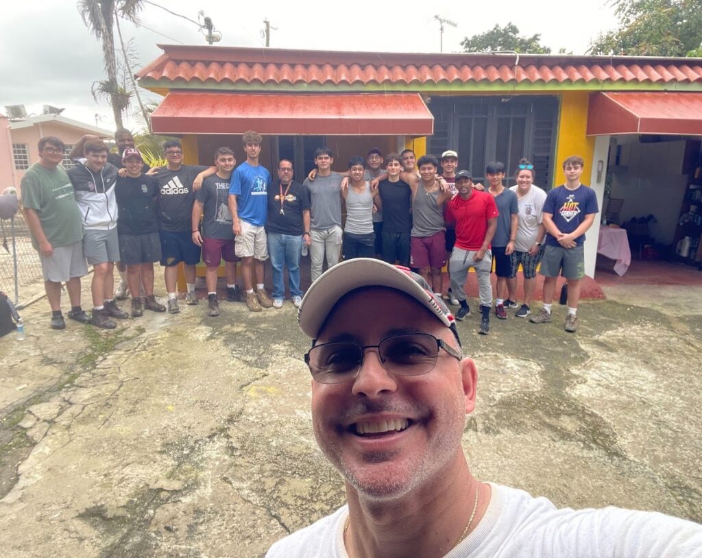 The Puerto Rico mission group. Center: Fr Abraham Feliciano. From left to right: Parker DelSasso ‘26, Quentin Hubner ‘26, Jack Schreiber ‘26, Torrance “Tank” Daniels, Aidan Ginolfi ‘26, Cristan Uykan ‘26, Hudson McAlear ‘26, a served individual, Julian Arbizu ‘26, Julius Viray ‘26, Kevin Joseph ‘26, Vincent Rodriguez ‘26, Peter Ritiu ‘26, Thomas Collins ‘26, Daniel Lopez ‘26, Cordel “Cody” High, Francis Tan ‘26, Ms. Elizabeth Hampson, and Marco Belluzi ‘26.